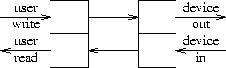For example, Figure 1 shows a stream device that has just been opened. The top-level routines, drawn as a pair of half-open rectangles on the left, are invoked by users' read and write calls. The writer routine sends messages to the device driver shown on the right. Data arriving from the device becomes messages sent to the top-level reader routine, which returns the data to the user process when it executes read.