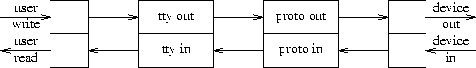 Figure 2 shows a stream with intermediate modules. This arrangement might be used when a terminal is connected to the computer through a network. The leftmost intermediate module carries out processing (such as character-erase and line-kill) needed for terminals, while the rightmost intermediate module does the flow- and error-control protocol needed to interface to the network.